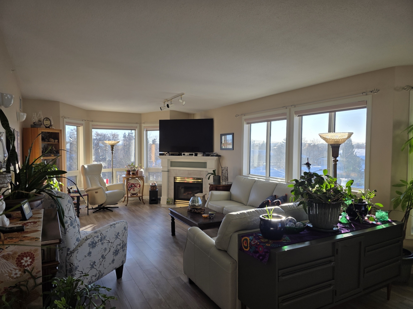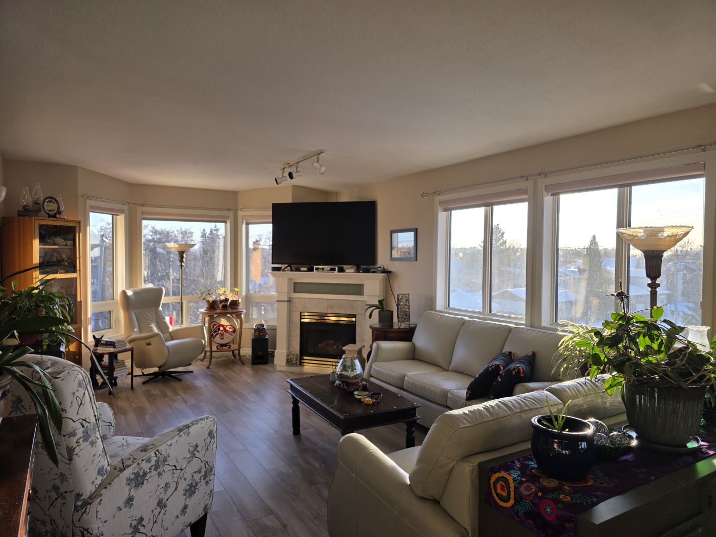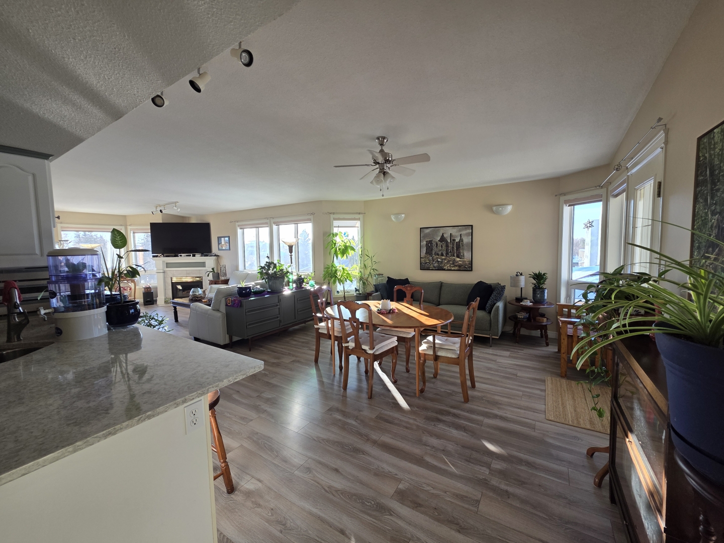 The kitchen overlooks the spacious dining area with river views, and plenty of area for entertaining. The large living room features oversized windows to the south and west providing wonderful daytime light, showcasing iconic Saskatchewan sunsets. With a gas fireplace it sets the perfect tone for cozy evenings or lazy weekends.