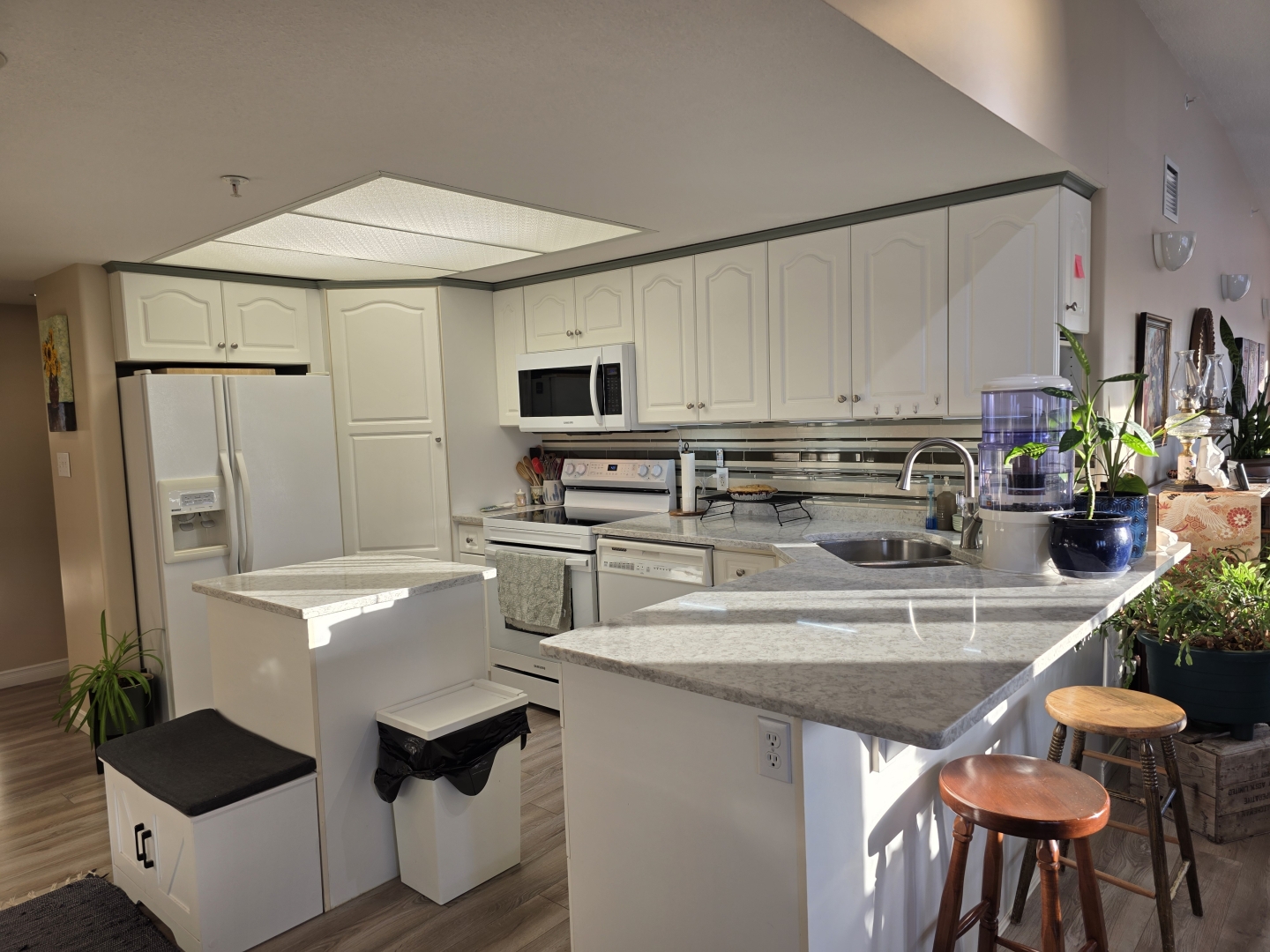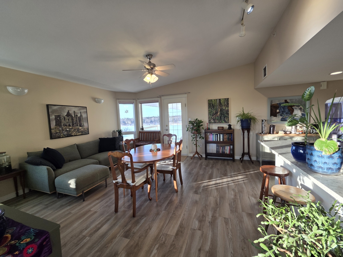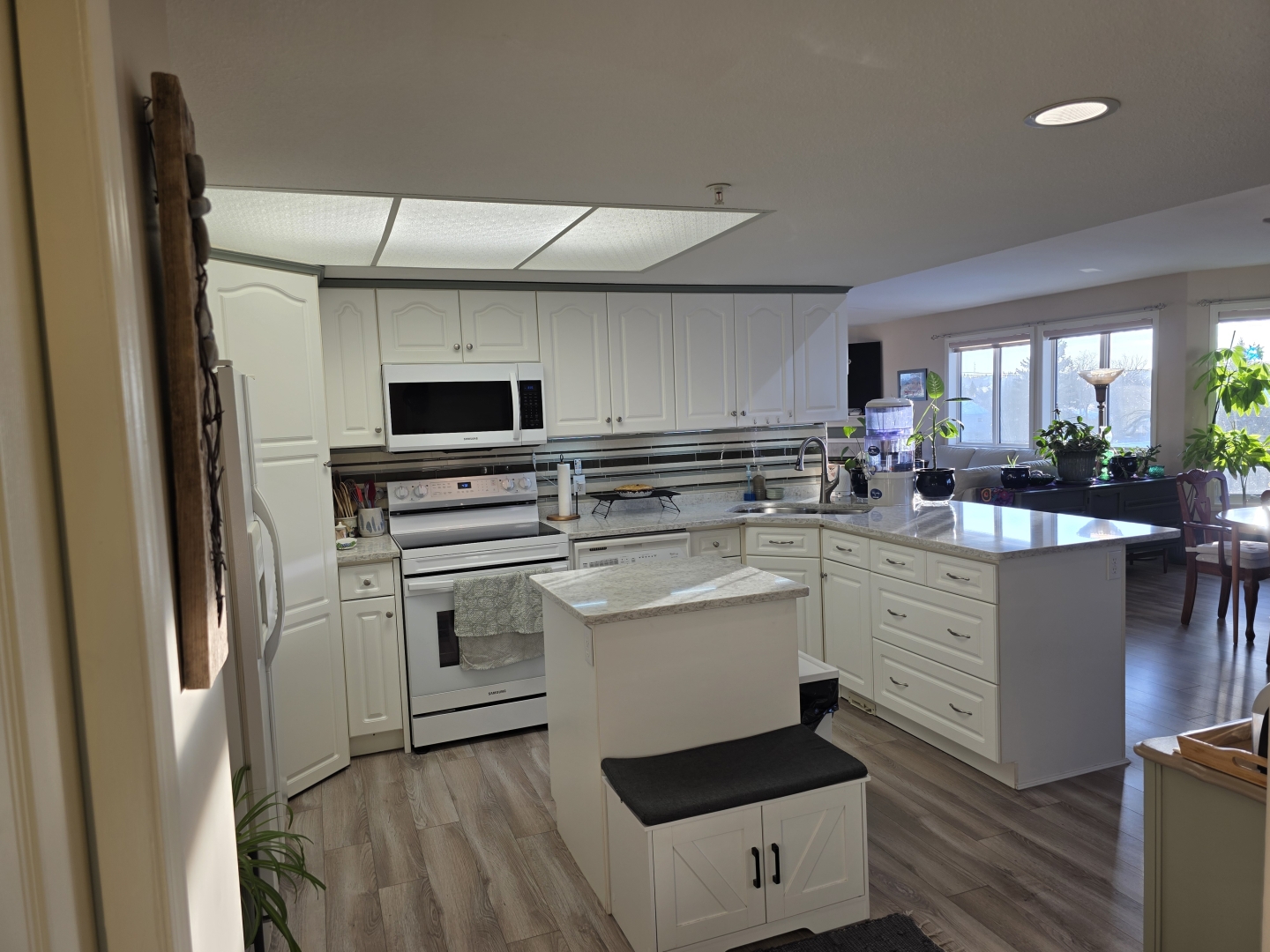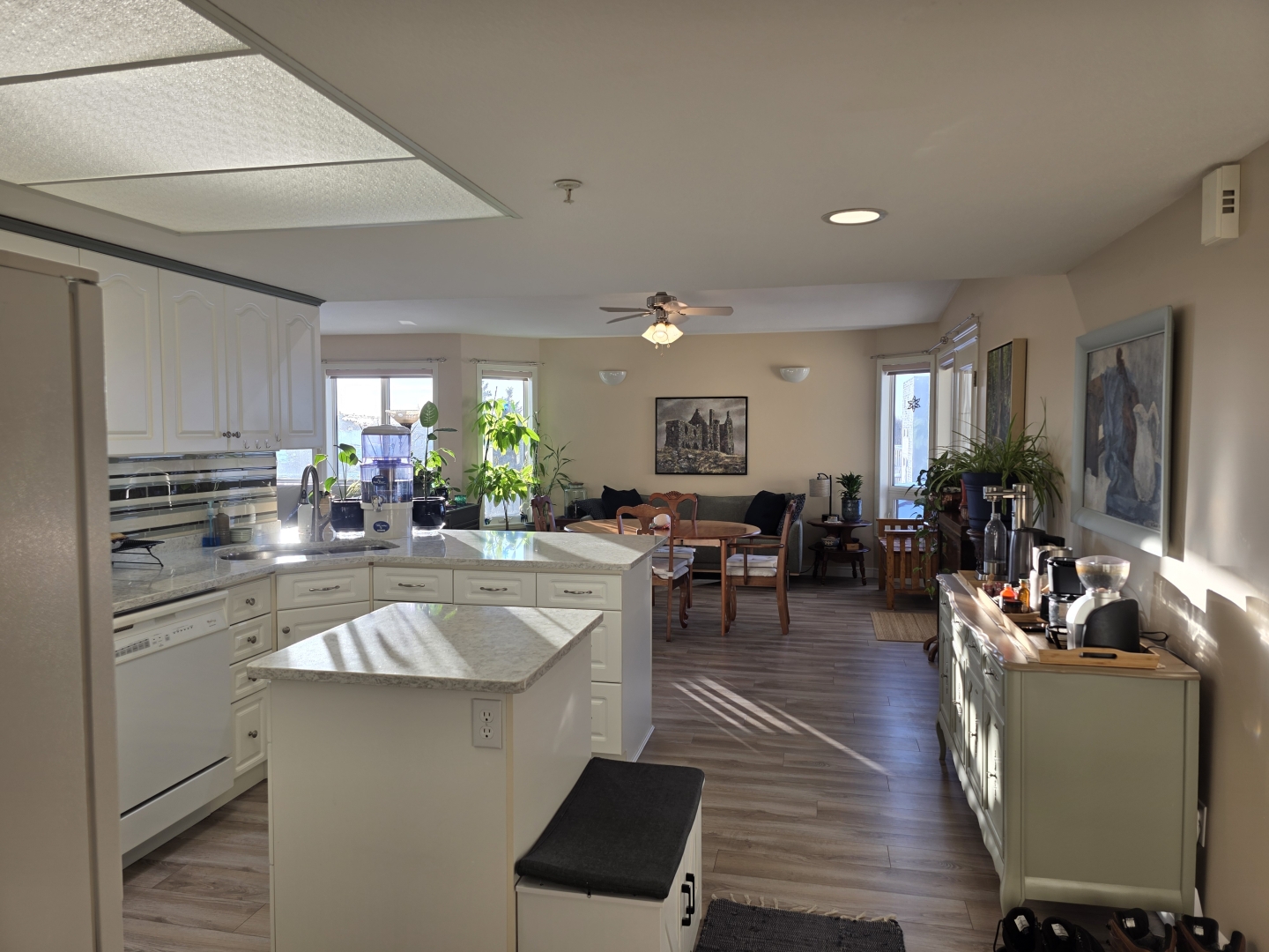 Inside, you’ll find the unit is flooded with natural light and panoramic views, an open concept layout with vaulted ceilings in the main living area, and laminate flooring throughout, creating the feeling of continuity from the moment you step inside.