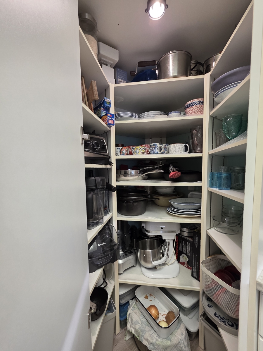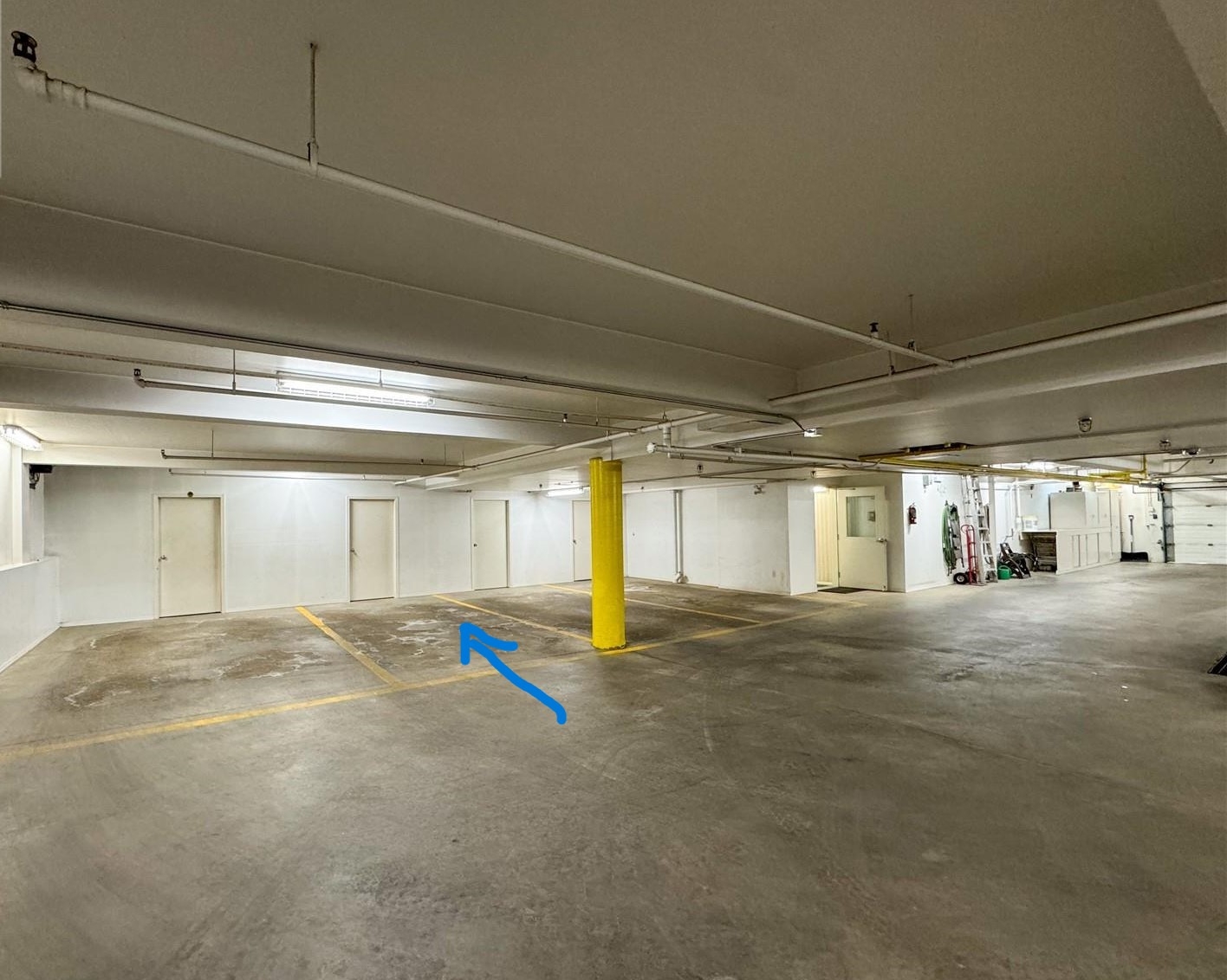 The unit has 2 dedicated parking spots (indoor & outdoor) and a heated storage unit with ample space/shelving.